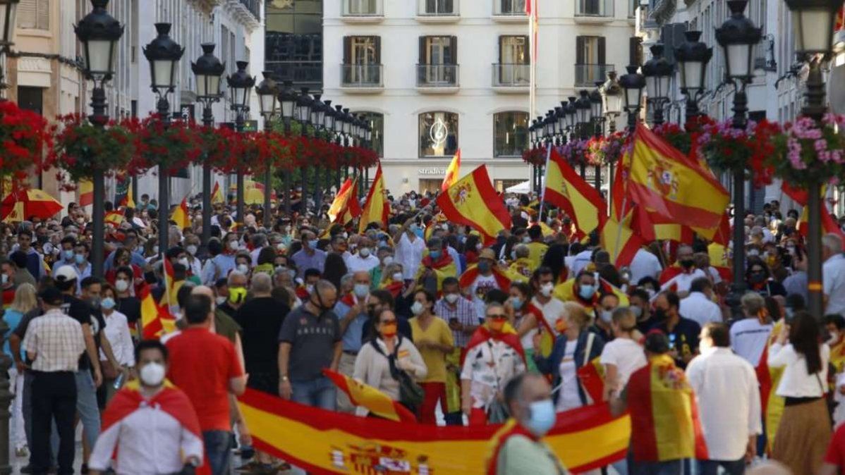 Hace ya días que las protestas por la gestión del Gobierno ante la crisis del coronavirus han llegado a las calles. Este jueves se ha hecho especialmente notable la de Málaga. Sobre las 19.30 horas, cientos de personas se han juntado en la calle Larios ataviados con banderas de España.
