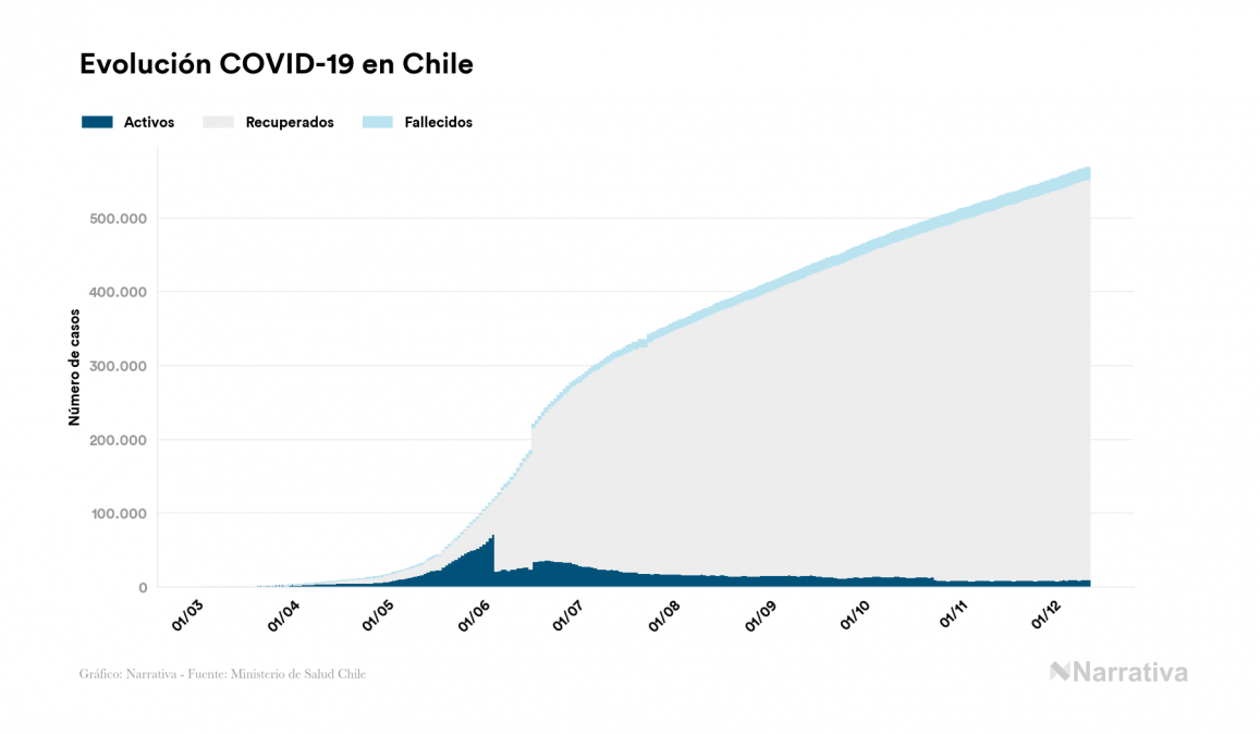La COVID-19 deja ya 567.974 casos de contagio en Chile, con 10.847 de ellos actualmente activos y 15.782 fallecidos, según los últimos datos correspondientes al 12 de diciembre. Además, un total de 541.345 personas ya se ha recuperado desde que se produjo el primer contagio en el país.