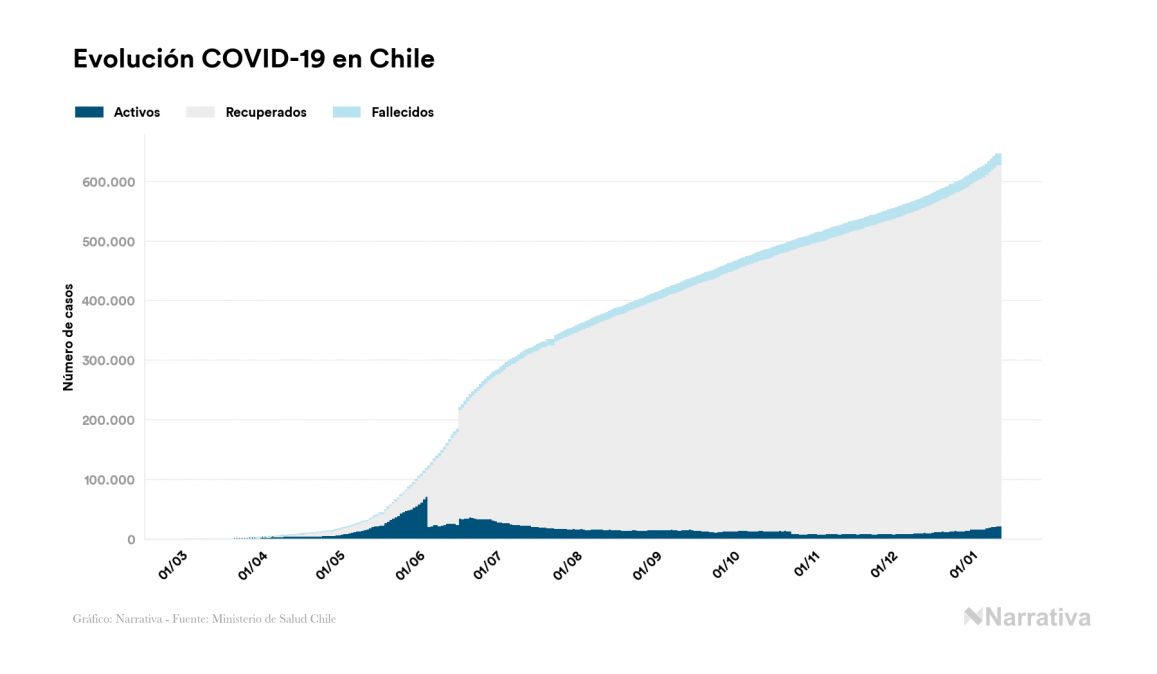 La COVID-19 deja ya 645.892 casos de contagio en Chile, con 22.675 de ellos actualmente activos y 17.162 fallecidos, según los últimos datos correspondientes al 12 de enero. Además, un total de 606.055 personas ya se ha recuperado desde que se produjo el primer contagio en el país.