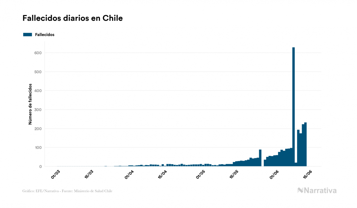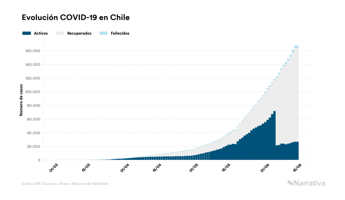 La COVID-19 deja ya 167.355 casos de contagio en Chile, con 26.958 de ellos actualmente activos y 3.101 fallecidos, según los últimos datos correspondientes al 14 de junio. Además, un total de 137.296 personas ya se ha recuperado desde que se produjo el primer contagio en el país.