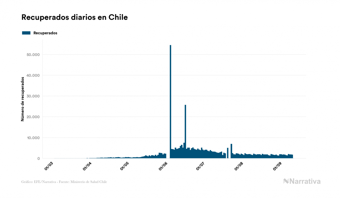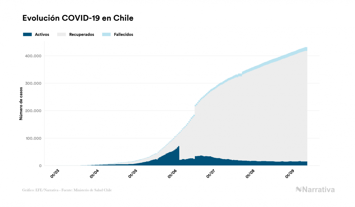 El coronavirus deja ya 430.535 casos de contagio en Chile, con 15.621 de ellos actualmente activos y 11.850 fallecidos, según los últimos datos correspondientes al 12 de septiembre. Además, un total de 403.064 personas ya se ha recuperado desde que se produjo el primer contagio en el país.