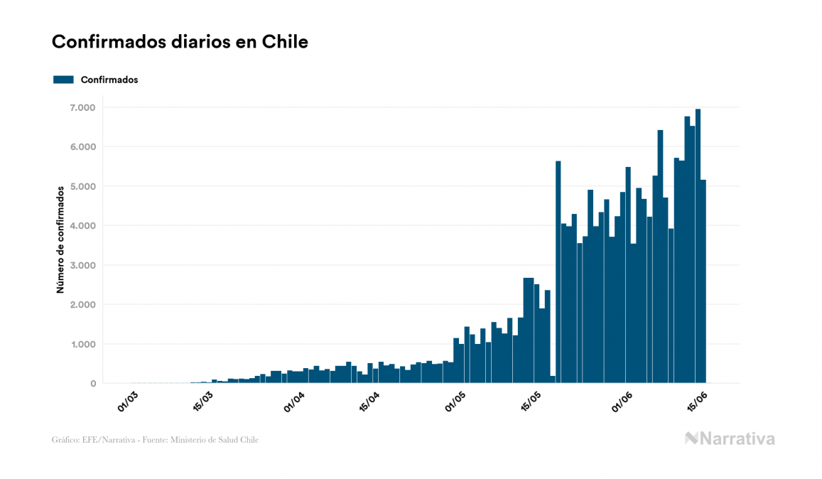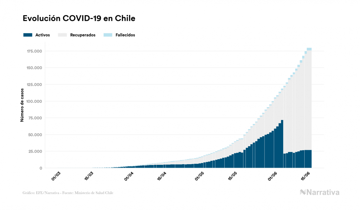 La COVID-19 deja ya 179.436 casos de contagio en Chile, con 27.282 de ellos actualmente activos y 3.362 fallecidos, según los últimos datos correspondientes al 16 de junio. Además, un total de 148.792 personas ya se ha recuperado desde que se produjo el primer contagio en el país.