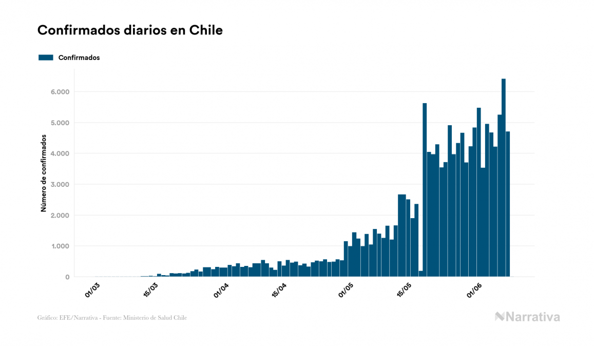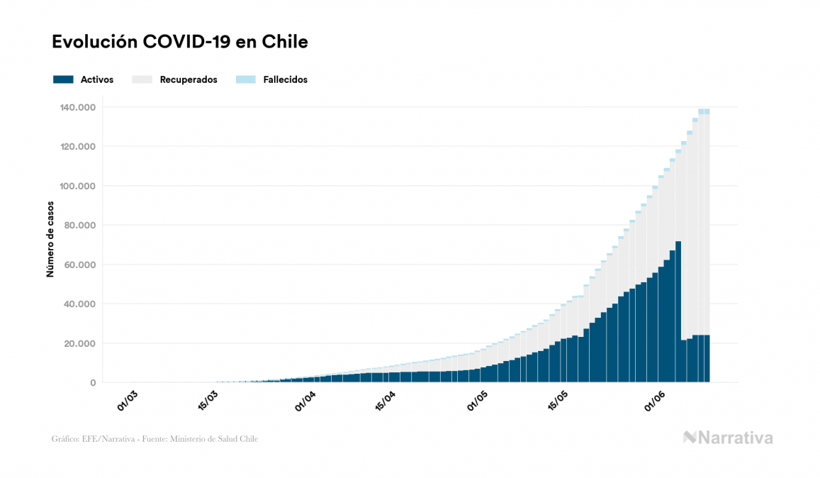 El nuevo coronavirus deja ya 138.846 casos de contagio en Chile, con 24.334 de ellos actualmente activos y 2.264 fallecidos, según los últimos datos correspondientes al 9 de junio. Además, un total de 112.248 personas ya se ha recuperado desde que se produjo el primer contagio en el país.