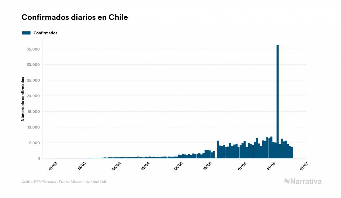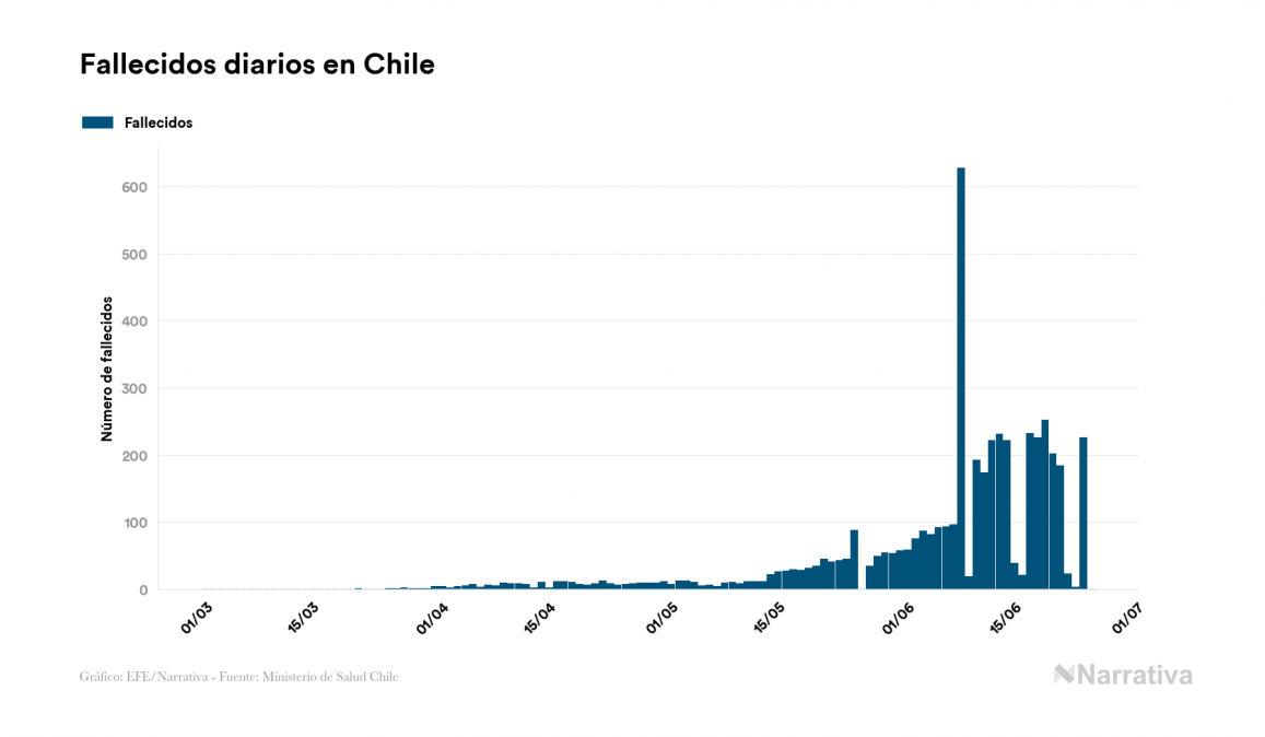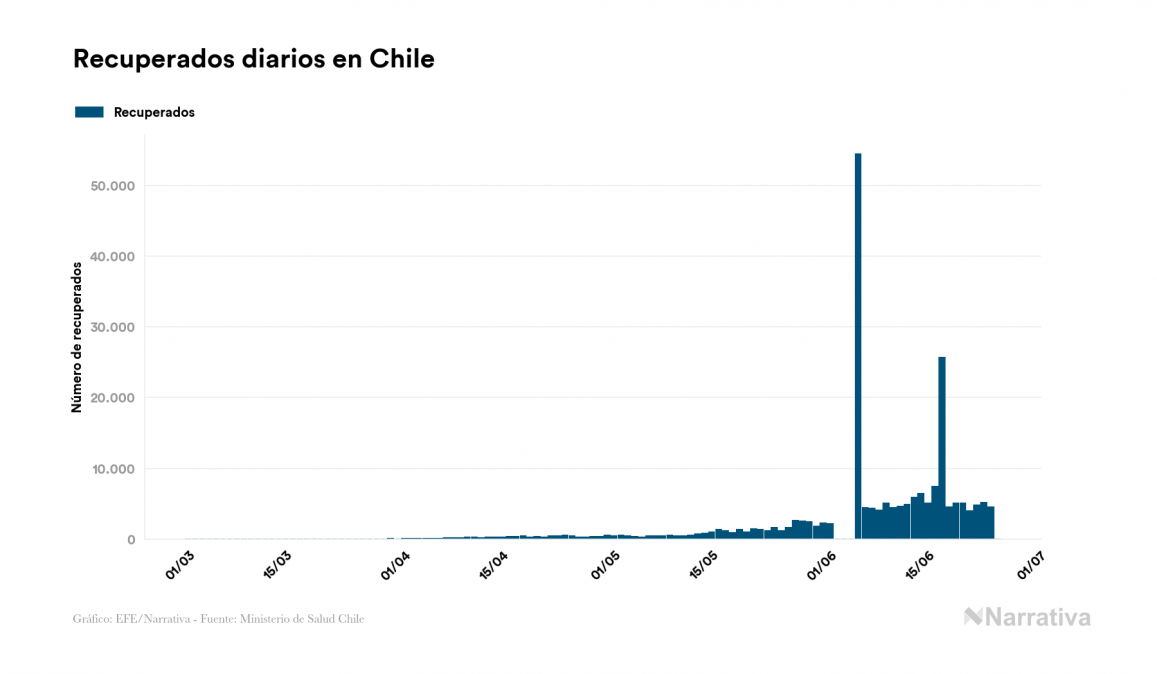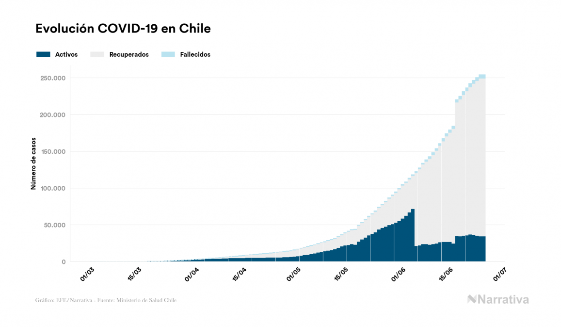 La COVID-19 deja ya 254.416 casos de contagio en Chile, con 34.592 de ellos actualmente activos y 4.731 fallecidos, según los últimos datos correspondientes al 25 de junio. Además, un total de 215.093 personas ya se ha recuperado desde que se produjo el primer contagio en el país.