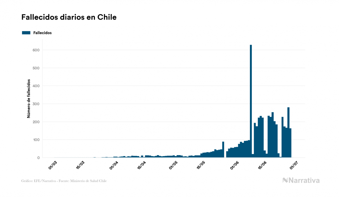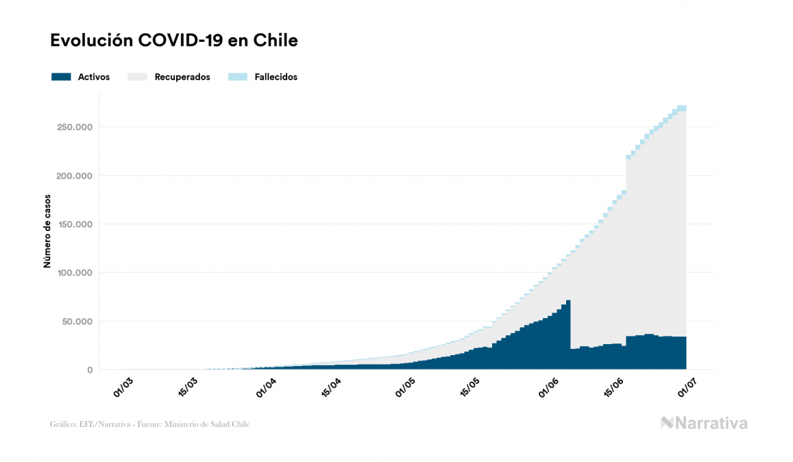 La COVID-19 deja ya 271.982 casos de contagio en Chile, con 34.263 de ellos actualmente activos y 5.509 fallecidos, según los últimos datos correspondientes al 29 de junio. Además, un total de 232.210 personas ya se ha recuperado desde que se produjo el primer contagio en el país.