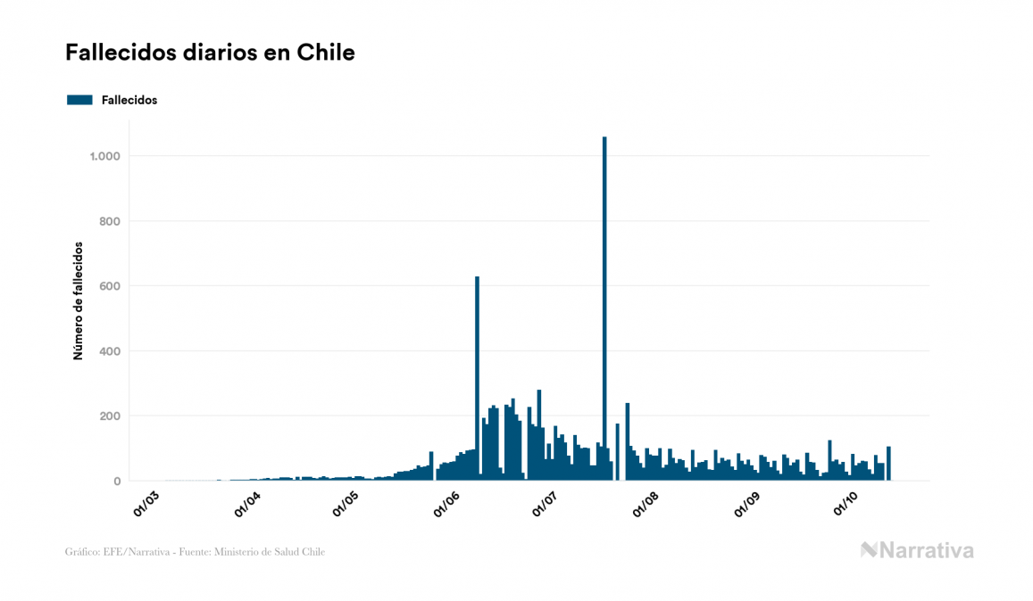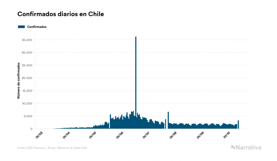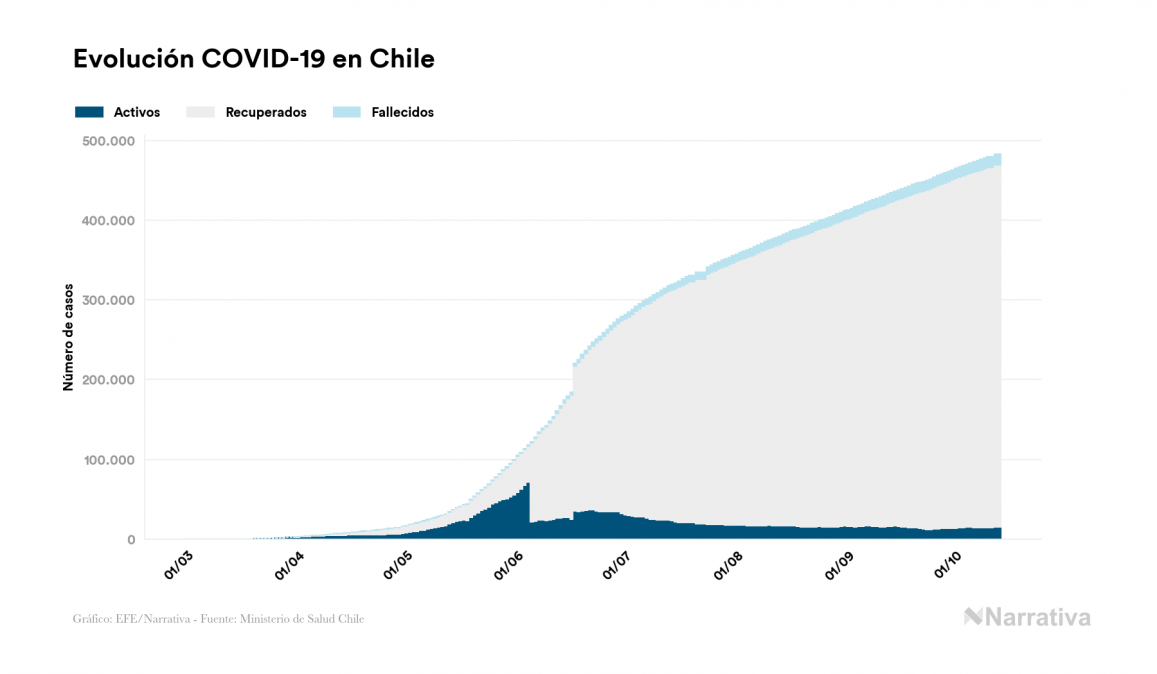 El coronavirus deja ya 482.832 casos de contagio en Chile, con 15.022 de ellos actualmente activos y 13.376 fallecidos, según los últimos datos correspondientes al 13 de octubre. Además, un total de 454.434 personas ya se ha recuperado desde que se produjo el primer contagio en el país.