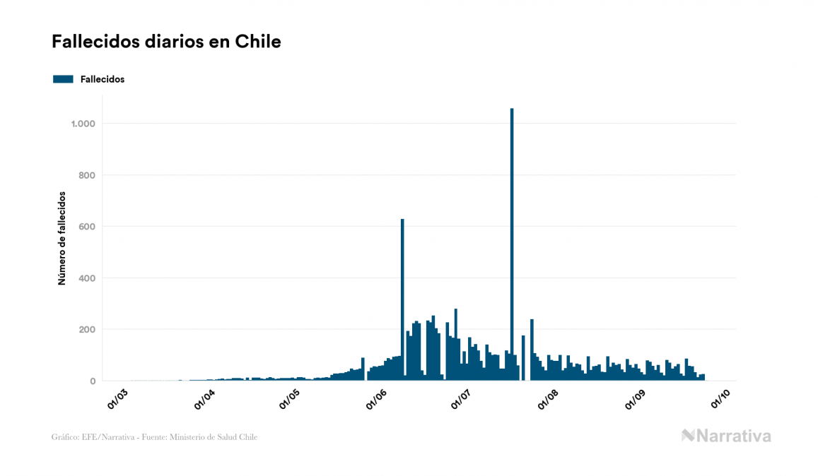 El coronavirus deja ya 449.903 casos de contagio en Chile, con 12.393 de ellos actualmente activos y 12.345 fallecidos, según los últimos datos correspondientes al 24 de septiembre. Además, un total de 425.165 personas ya se ha recuperado desde que se produjo el primer contagio en el país.