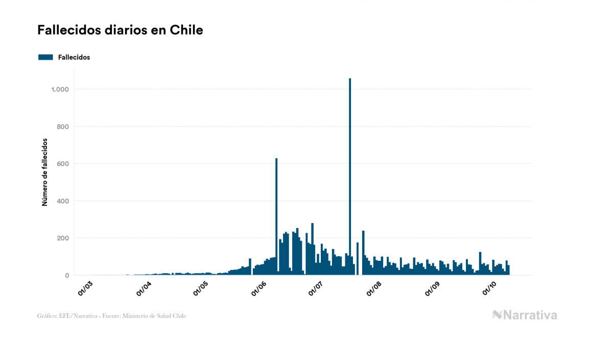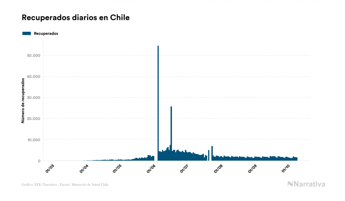 El nuevo coronavirus deja ya 477.769 casos de contagio en Chile, con 14.252 de ellos actualmente activos y 13.220 fallecidos, según los últimos datos correspondientes al 10 de octubre. Además, un total de 450.297 personas ya se ha recuperado desde que se produjo el primer contagio en el país.