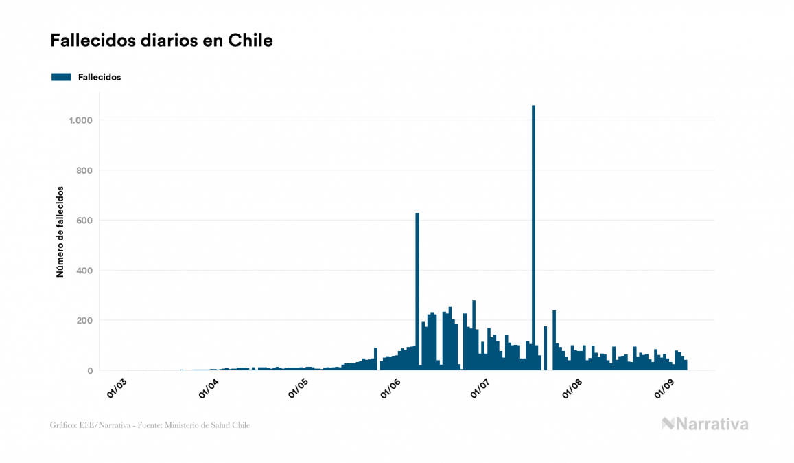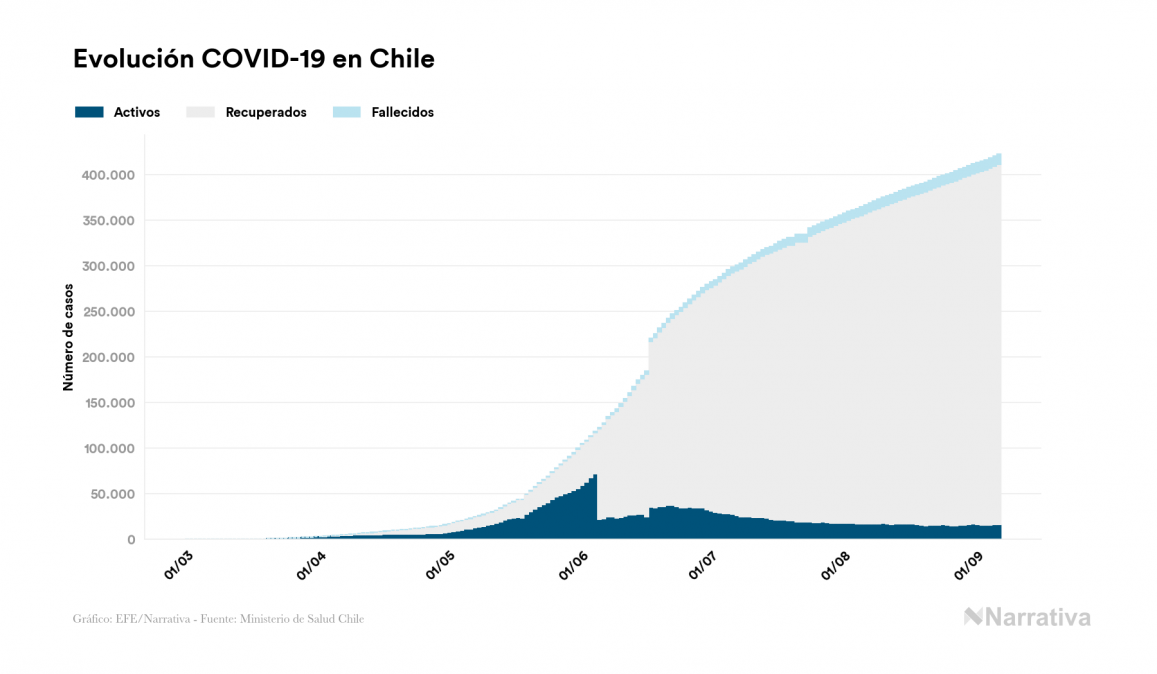 Según los últimos datos, actualmente en Chile hay 16.519 casos activos de COVID-19 tras confirmarse 2.076 nuevos positivos y 1.432 altas médicas este domingo. Desde el comienzo de la pandemia, el número total de contagiados asciende a 422.510, con 394.399 recuperados y 11.592 fallecidos.
