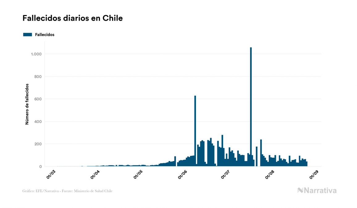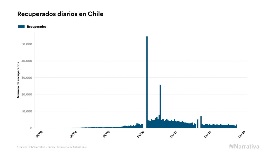 La COVID-19 deja ya 400.985 casos de contagio en Chile, con 15.564 de ellos actualmente activos y 10.958 fallecidos, según los últimos datos correspondientes al 26 de agosto. Además, un total de 374.463 personas ya se ha recuperado desde que se produjo el primer contagio en el país.