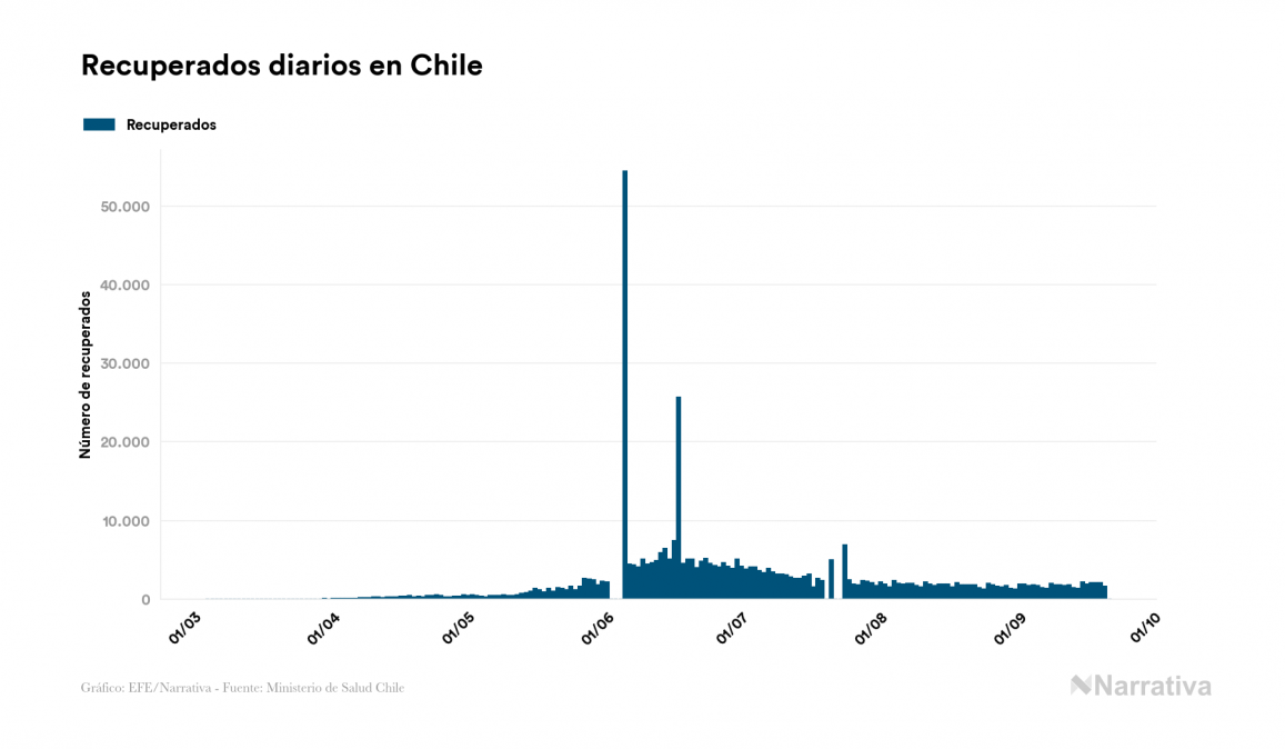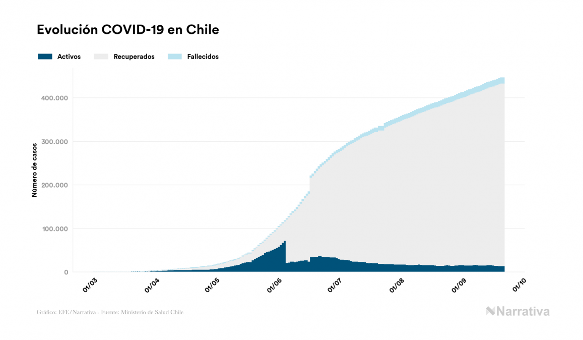 El coronavirus deja ya 446.274 casos de contagio en Chile, con 14.242 de ellos actualmente activos y 12.286 fallecidos, según los últimos datos correspondientes al 21 de septiembre. Además, un total de 419.746 personas ya se ha recuperado desde que se produjo el primer contagio en el país.
