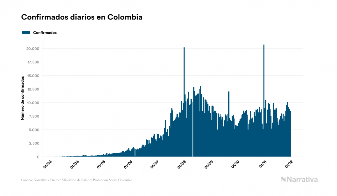 El nuevo coronavirus deja ya 1.316.806 casos de contagio en Colombia, con 69.551 de ellos actualmente activos y 36.766 fallecidos, según los últimos datos correspondientes al 1 de diciembre. Además, un total de 1.210.489 personas ya se ha recuperado desde que se produjo el primer contagio en el país.