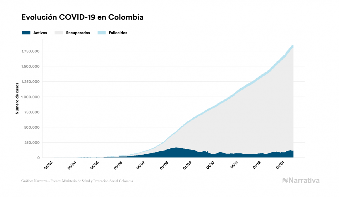 El coronavirus deja ya 1.849.101 casos de contagio en Colombia, con 117.775 de ellos actualmente activos y 47.491 fallecidos, según los últimos datos correspondientes al 15 de enero. Además, un total de 1.683.835 personas ya se ha recuperado desde que se produjo el primer contagio en el país.