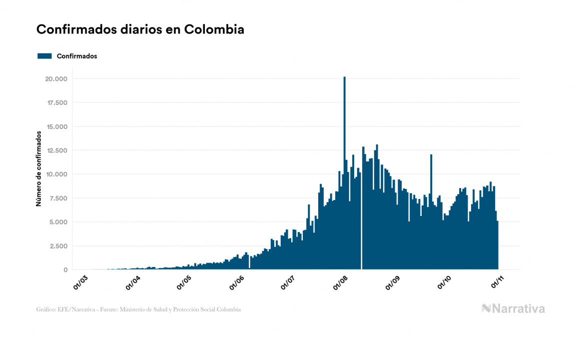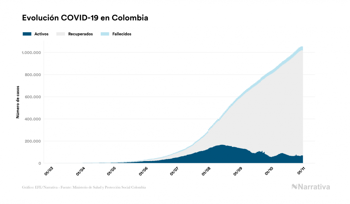 El nuevo coronavirus deja ya 1.053.122 casos de contagio en Colombia, con 925.831 de ellos actualmente activos y 31.421 fallecidos, según los últimos datos correspondientes al 31 de octubre. Además, un total de 95.870 personas ya se ha recuperado desde que se produjo el primer contagio en el país.