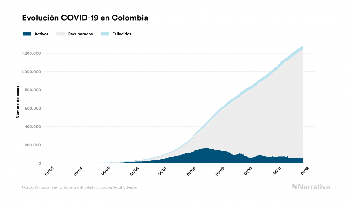 El coronavirus deja ya 1.270.991 casos de contagio en Colombia, con 60.172 de ellos actualmente activos y 35.860 fallecidos, según los últimos datos correspondientes al 26 de noviembre. Además, un total de 1.174.959 personas ya se ha recuperado desde que se produjo el primer contagio en el país.