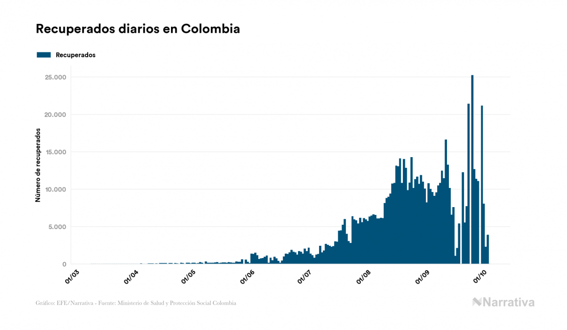 El nuevo coronavirus deja ya 848.147 casos de contagio en Colombia, con 63.790 de ellos actualmente activos y 26.556 fallecidos, según los últimos datos correspondientes al 4 de octubre. Además, un total de 757.801 personas ya se ha recuperado desde que se produjo el primer contagio en el país.