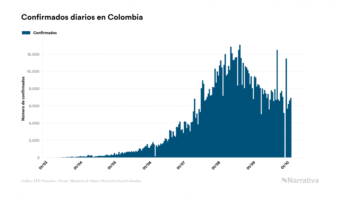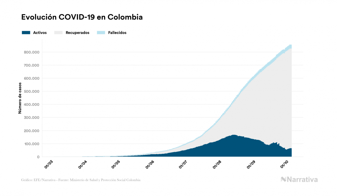 El nuevo coronavirus deja ya 855.052 casos de contagio en Colombia, con 66.666 de ellos actualmente activos y 26.712 fallecidos, según los últimos datos correspondientes al 5 de octubre. Además, un total de 761.674 personas ya se ha recuperado desde que se produjo el primer contagio en el país.