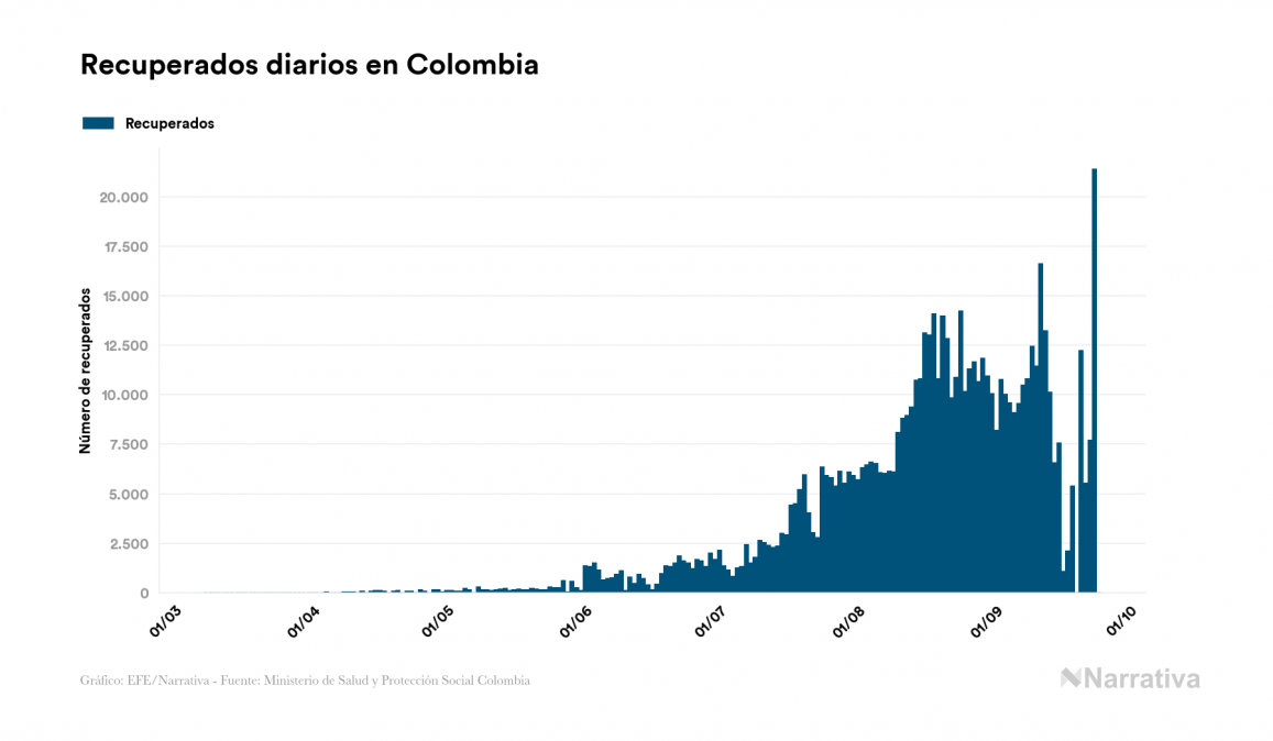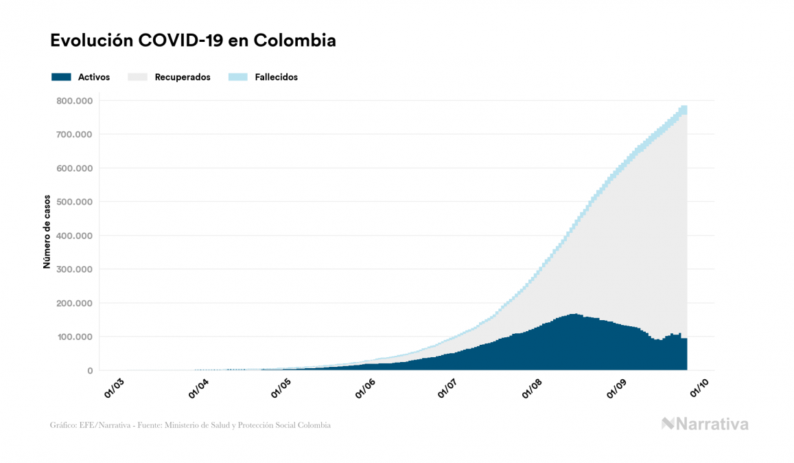 El nuevo coronavirus deja ya 784.268 casos de contagio en Colombia, con 97.245 de ellos actualmente activos y 24.746 fallecidos, según los últimos datos correspondientes al 24 de septiembre. Además, un total de 662.277 personas ya se ha recuperado desde que se produjo el primer contagio en el país.