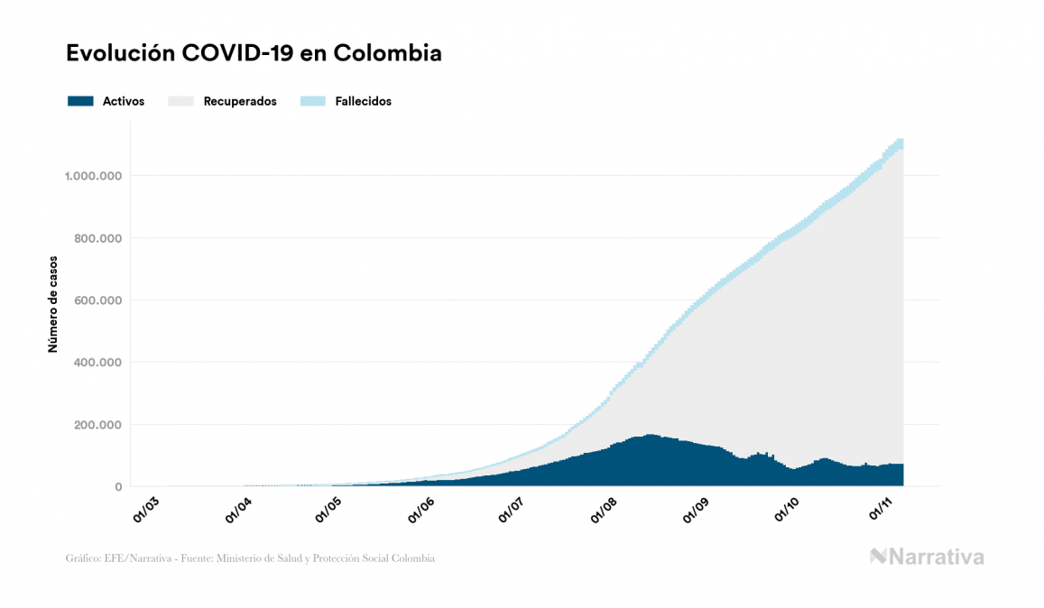 El coronavirus deja ya 1.117.977 casos de contagio en Colombia, con 74.602 de ellos actualmente activos y 32.209 fallecidos, según los últimos datos correspondientes al 6 de noviembre. Además, un total de 1.011.166 personas ya se ha recuperado desde que se produjo el primer contagio en el país.