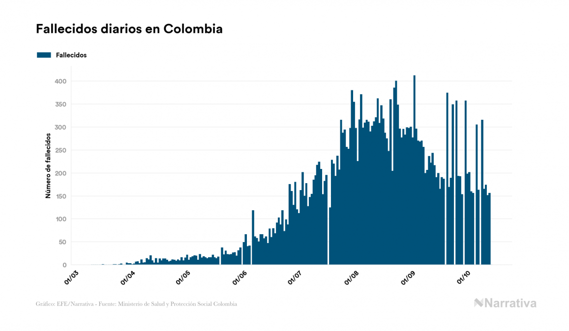 El coronavirus deja ya 924.098 casos de contagio en Colombia, con 89.254 de ellos actualmente activos y 28.141 fallecidos, según los últimos datos correspondientes al 14 de octubre. Además, un total de 806.703 personas ya se ha recuperado desde que se produjo el primer contagio en el país.