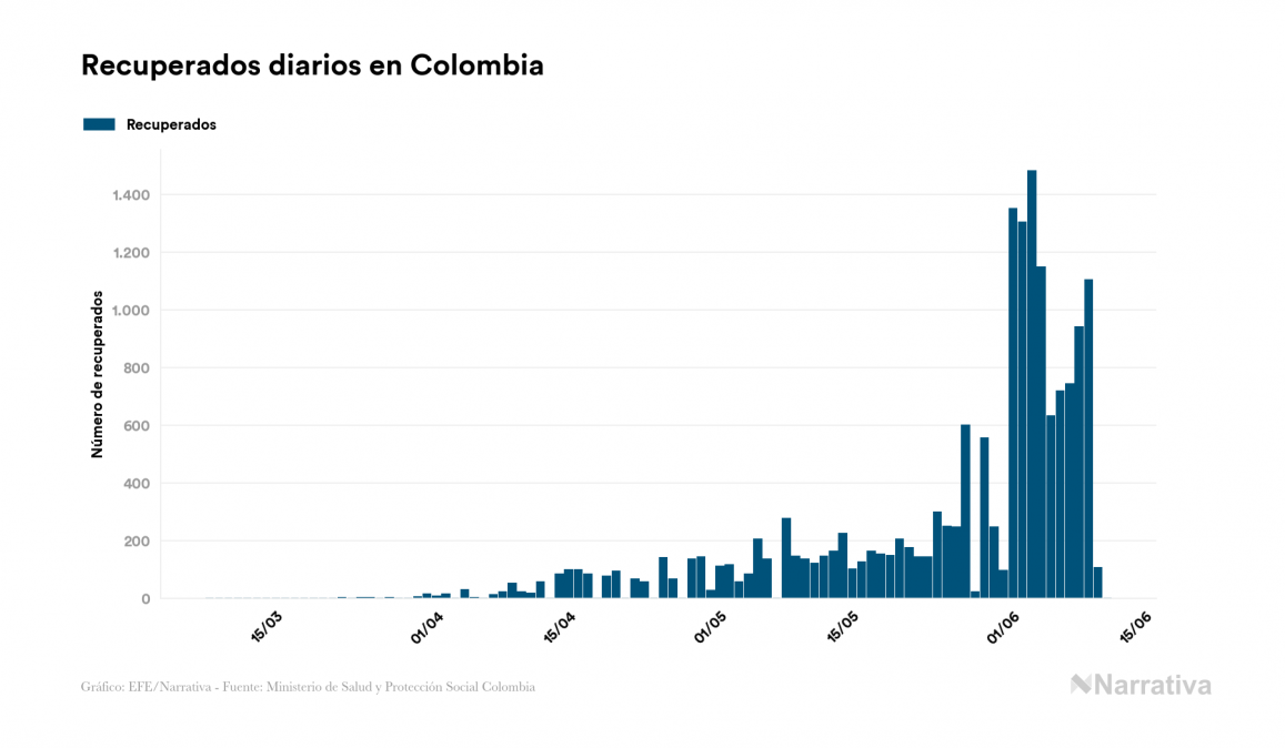 La COVID-19 deja ya 42.206 casos de contagio en Colombia, con 24.201 de ellos actualmente activos y 1.439 fallecidos, según los últimos datos correspondientes al 11 de junio. Además, un total de 16.566 personas ya se ha recuperado desde que se produjo el primer contagio en el país.