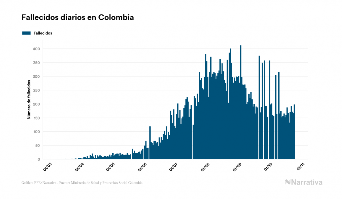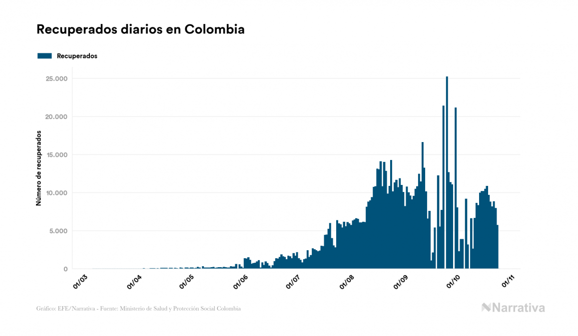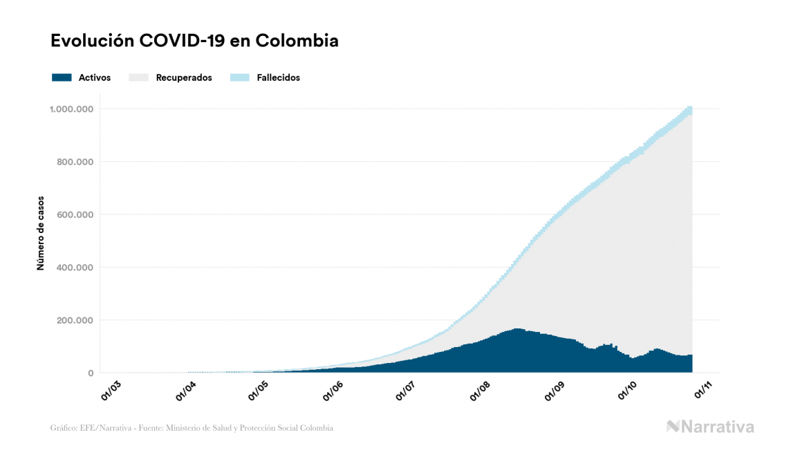El nuevo coronavirus deja ya 1.007.711 casos de contagio en Colombia, con 70.332 de ellos actualmente activos y 30.000 fallecidos, según los últimos datos correspondientes al 25 de octubre. Además, un total de 907.379 personas ya se ha recuperado desde que se produjo el primer contagio en el país.