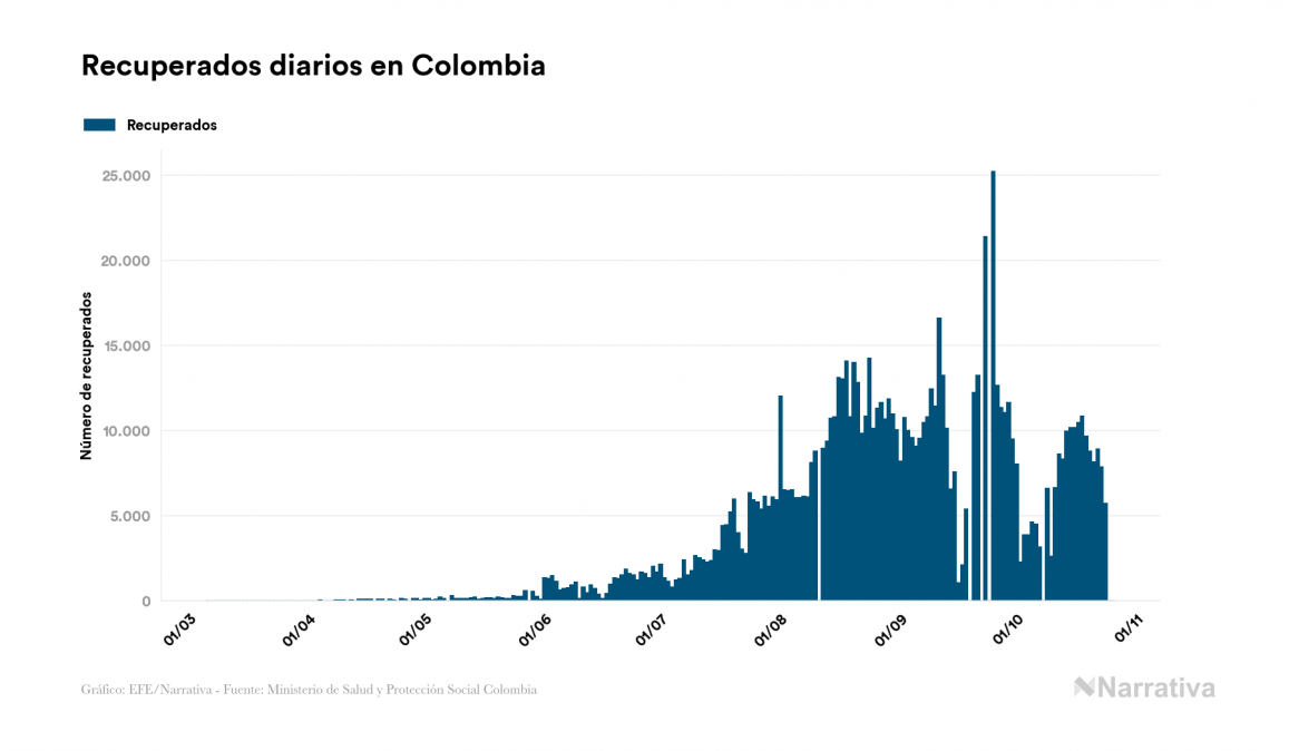 El nuevo coronavirus deja ya 1.015.885 casos de contagio en Colombia, con 78.506 de ellos actualmente activos y 30.000 fallecidos, según los últimos datos correspondientes al 26 de octubre. Además, un total de 907.379 personas ya se ha recuperado desde que se produjo el primer contagio en el país.