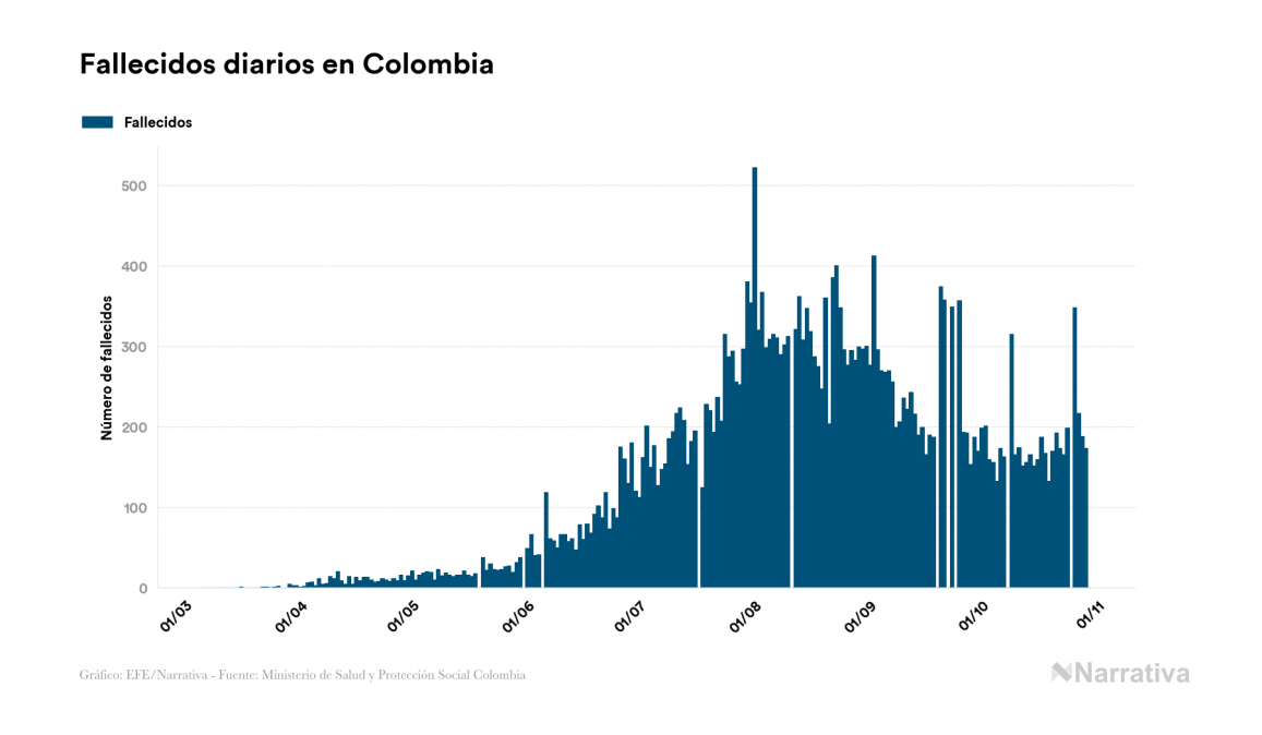 El nuevo coronavirus deja ya 1.048.055 casos de contagio en Colombia, con 66.781 de ellos actualmente activos y 30.926 fallecidos, según los últimos datos correspondientes al 30 de octubre. Además, un total de 950.348 personas ya se ha recuperado desde que se produjo el primer contagio en el país.