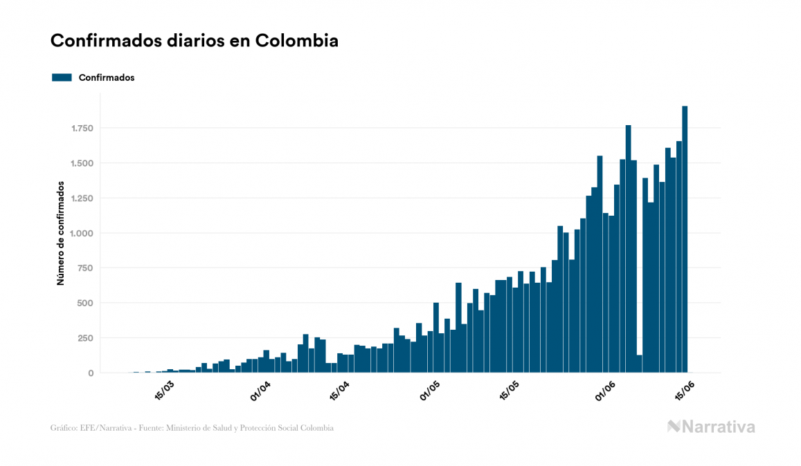 La COVID-19 deja ya 48.896 casos de contagio en Colombia, con 27.766 de ellos actualmente activos y 1.670 fallecidos, según los últimos datos correspondientes al 15 de junio. Además, un total de 19.460 personas ya se ha recuperado desde que se produjo el primer contagio en el país.