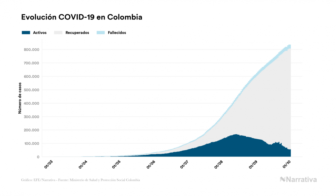El coronavirus deja ya 835.339 casos de contagio en Colombia, con 57.452 de ellos actualmente activos y 26.196 fallecidos, según los últimos datos correspondientes al 2 de octubre. Además, un total de 751.691 personas ya se ha recuperado desde que se produjo el primer contagio en el país.