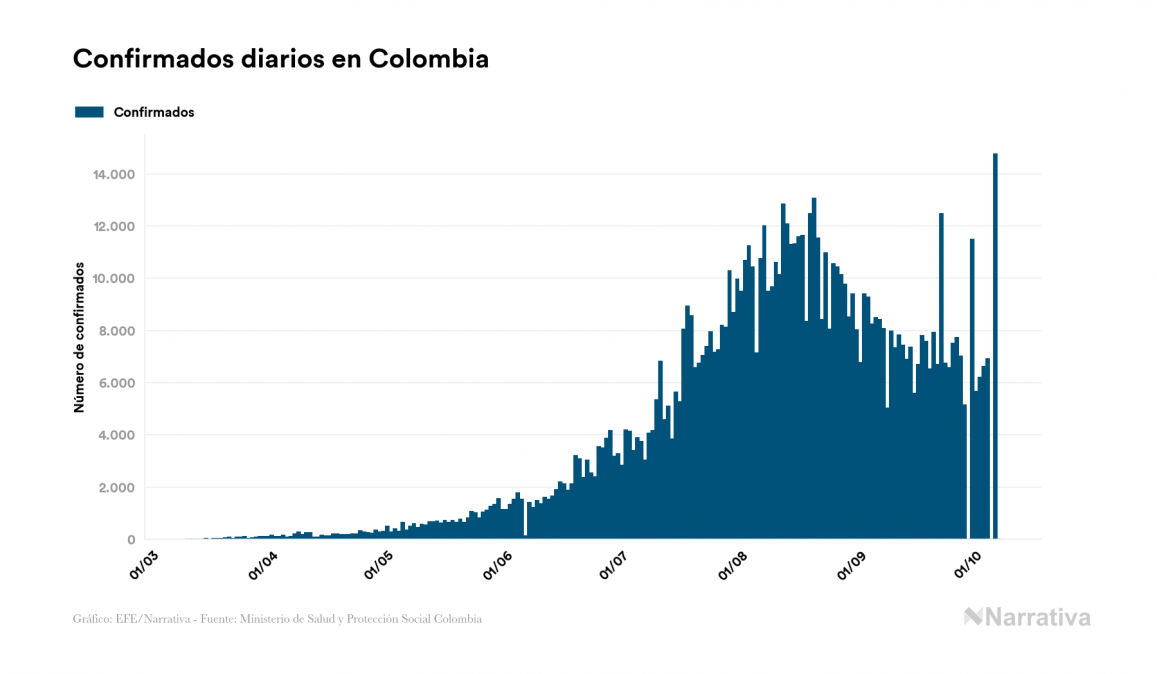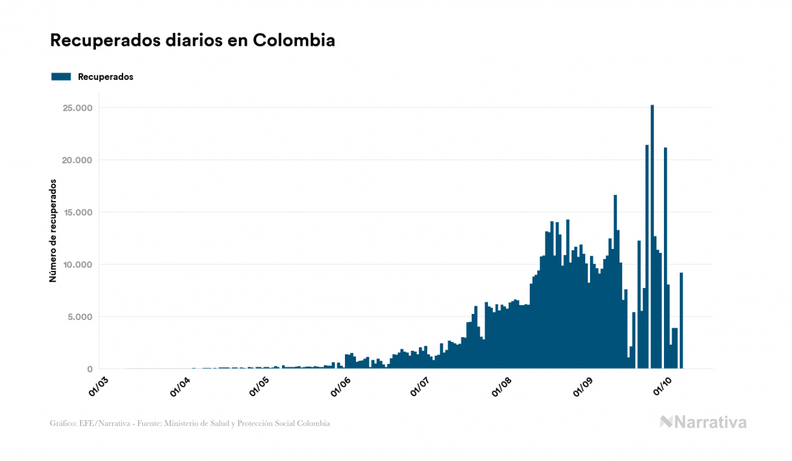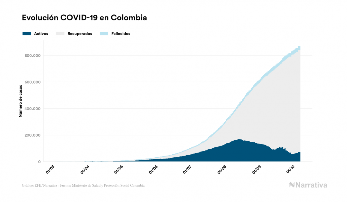 El coronavirus deja ya 869.808 casos de contagio en Colombia, con 71.979 de ellos actualmente activos y 27.017 fallecidos, según los últimos datos correspondientes al 7 de octubre. Además, un total de 770.812 personas ya se ha recuperado desde que se produjo el primer contagio en el país.