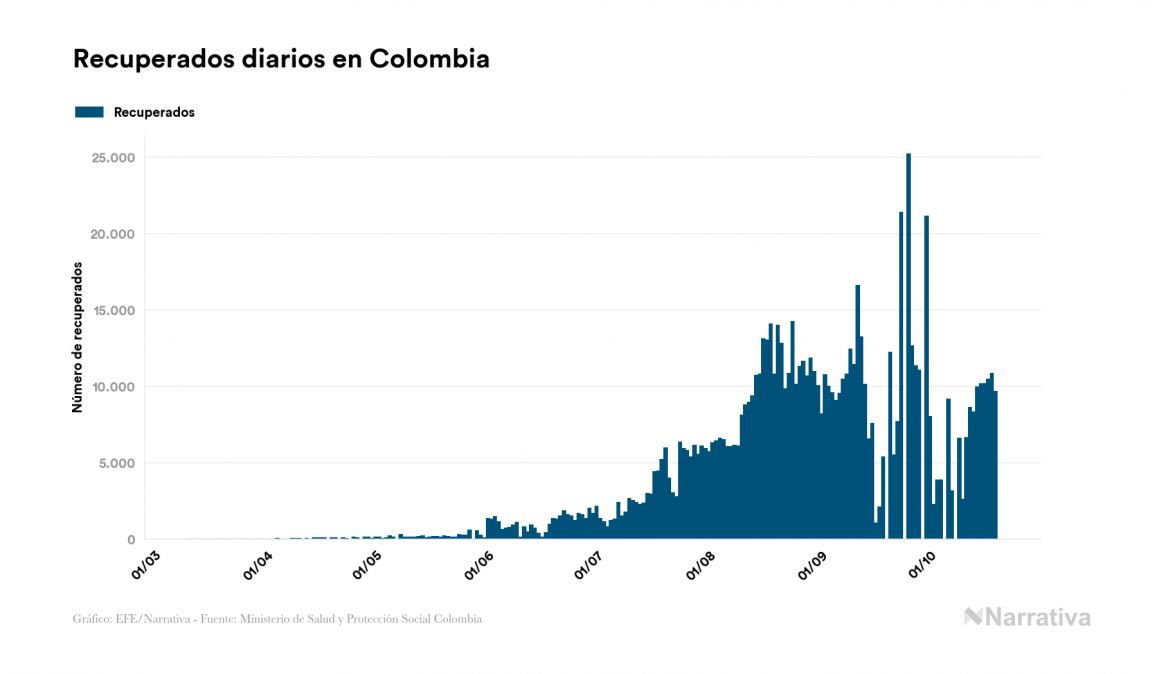 El nuevo coronavirus deja ya 965.883 casos de contagio en Colombia, con 68.820 de ellos actualmente activos y 29.102 fallecidos, según los últimos datos correspondientes al 20 de octubre. Además, un total de 867.961 personas ya se ha recuperado desde que se produjo el primer contagio en el país.