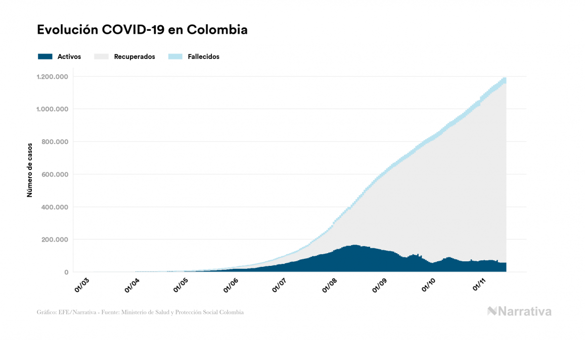 El coronavirus deja ya 1.191.634 casos de contagio en Colombia, con 60.229 de ellos actualmente activos y 33.829 fallecidos, según los últimos datos correspondientes al 15 de noviembre. Además, un total de 1.097.576 personas ya se ha recuperado desde que se produjo el primer contagio en el país.