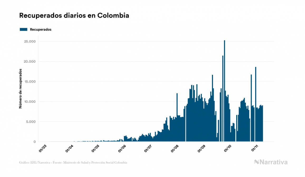 El nuevo coronavirus deja ya 1.143.887 casos de contagio en Colombia, con 73.014 de ellos actualmente activos y 32.791 fallecidos, según los últimos datos correspondientes al 9 de noviembre. Además, un total de 1.038.082 personas ya se ha recuperado desde que se produjo el primer contagio en el país.