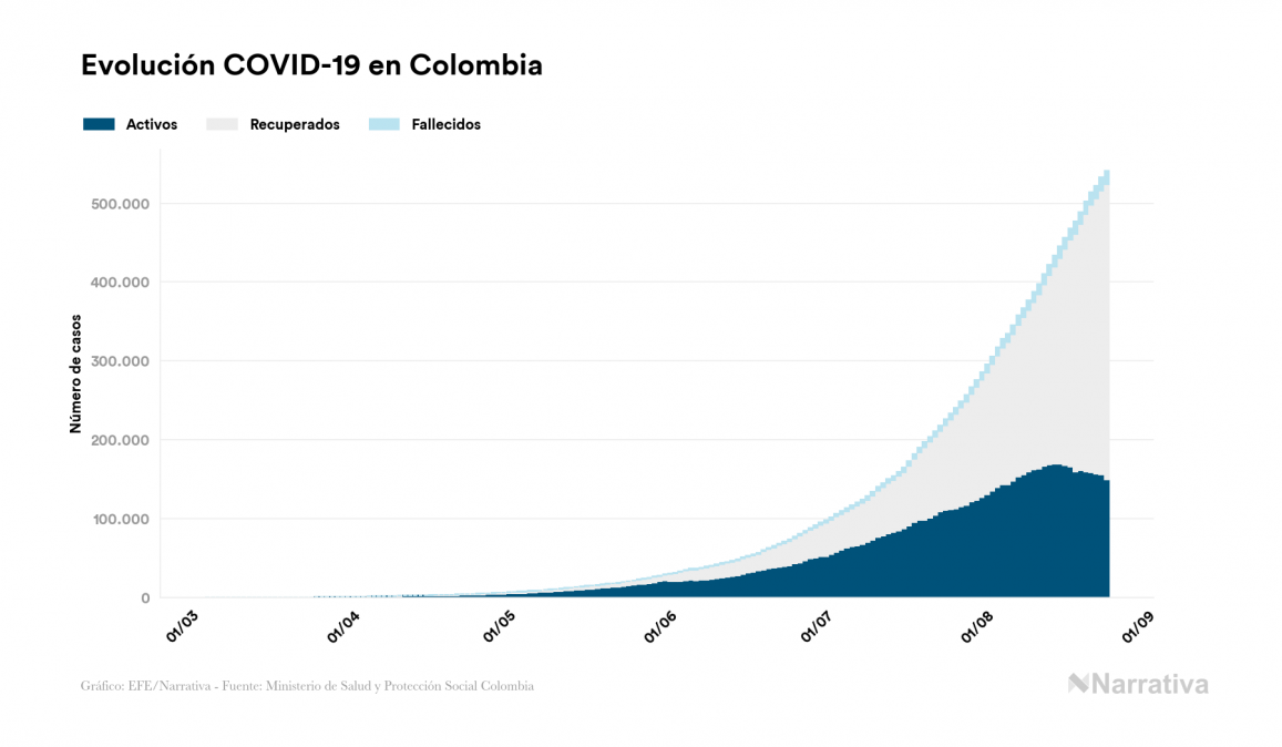Según los últimos datos, Colombia continúa con 149.799 casos activos de COVID-19 tras confirmarse 8.036 nuevos positivos y 14.232 altas médicas este lunes. Desde el comienzo de la pandemia, el número total de contagiados asciende a 541.139, con 374.024 recuperados y 17.316 fallecidos.
