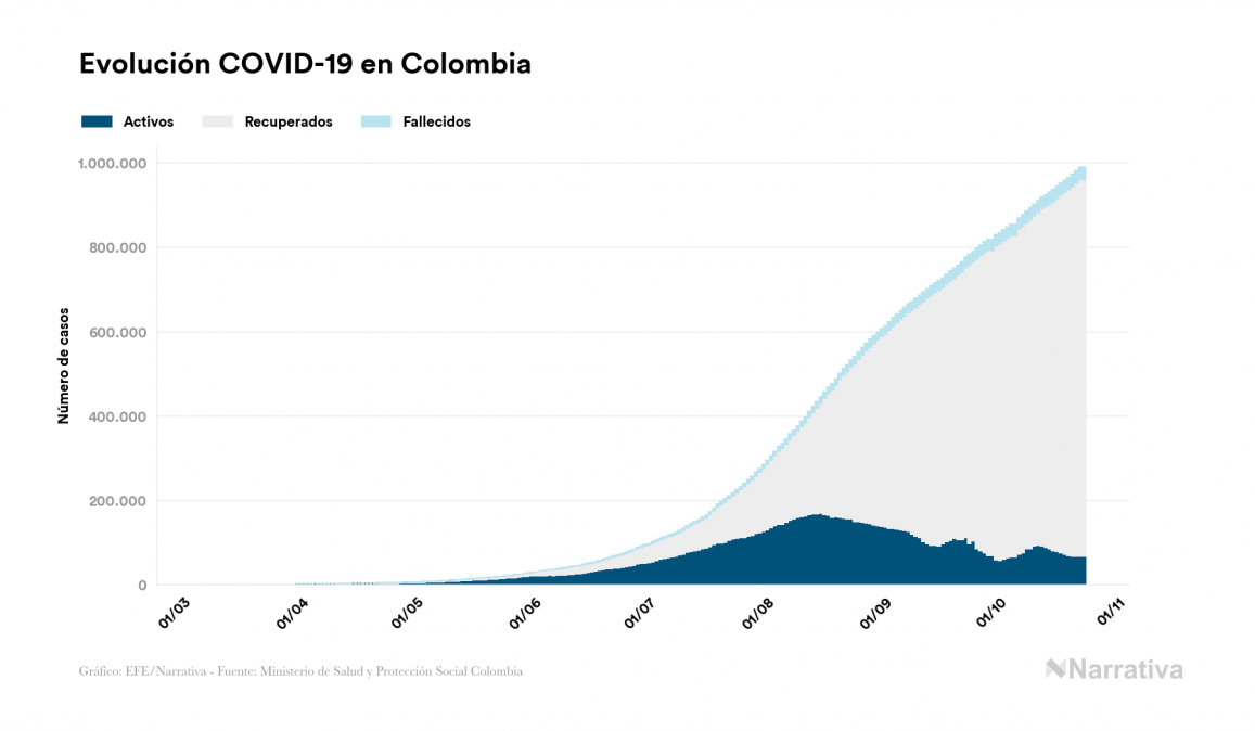 El nuevo coronavirus deja ya 990.373 casos de contagio en Colombia, con 66.926 de ellos actualmente activos y 29.637 fallecidos, según los últimos datos correspondientes al 23 de octubre. Además, un total de 893.810 personas ya se ha recuperado, tras sumarse 98 en el último informe.