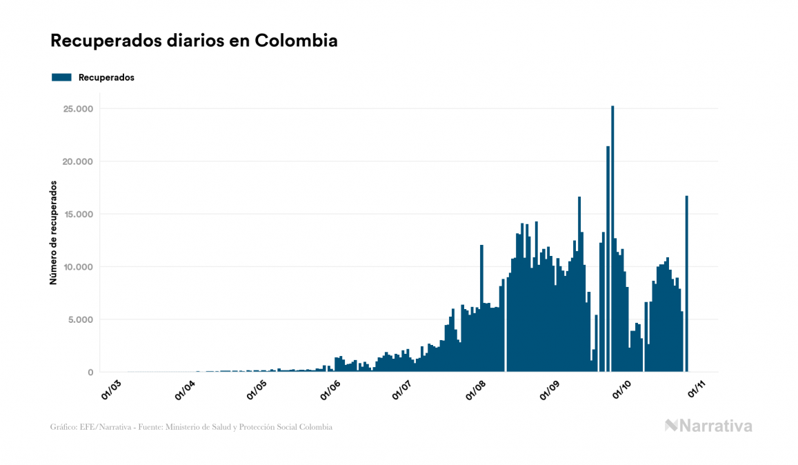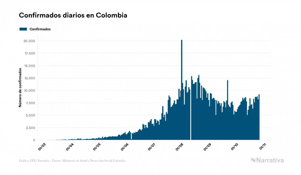El coronavirus deja ya 1.025.052 casos de contagio en Colombia, con 70.660 de ellos actualmente activos y 30.348 fallecidos, según los últimos datos correspondientes al 27 de octubre. Además, un total de 924.044 personas ya se ha recuperado desde que se produjo el primer contagio en el país.
