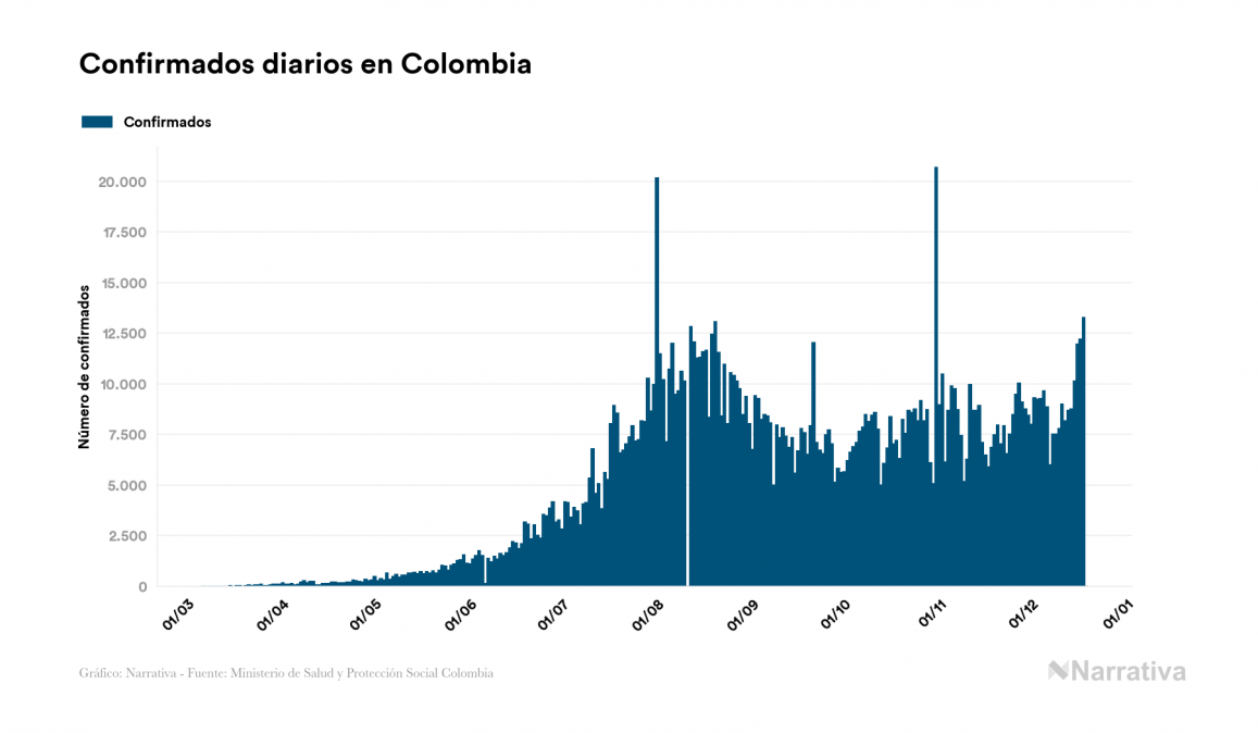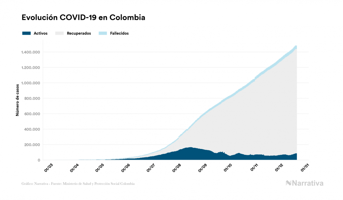 El nuevo coronavirus deja ya 1.482.072 casos de contagio en Colombia, con 88.032 de ellos actualmente activos y 40.019 fallecidos, según los últimos datos correspondientes al 19 de diciembre. Además, un total de 1.354.021 personas ya se ha recuperado desde que se produjo el primer contagio en el país.