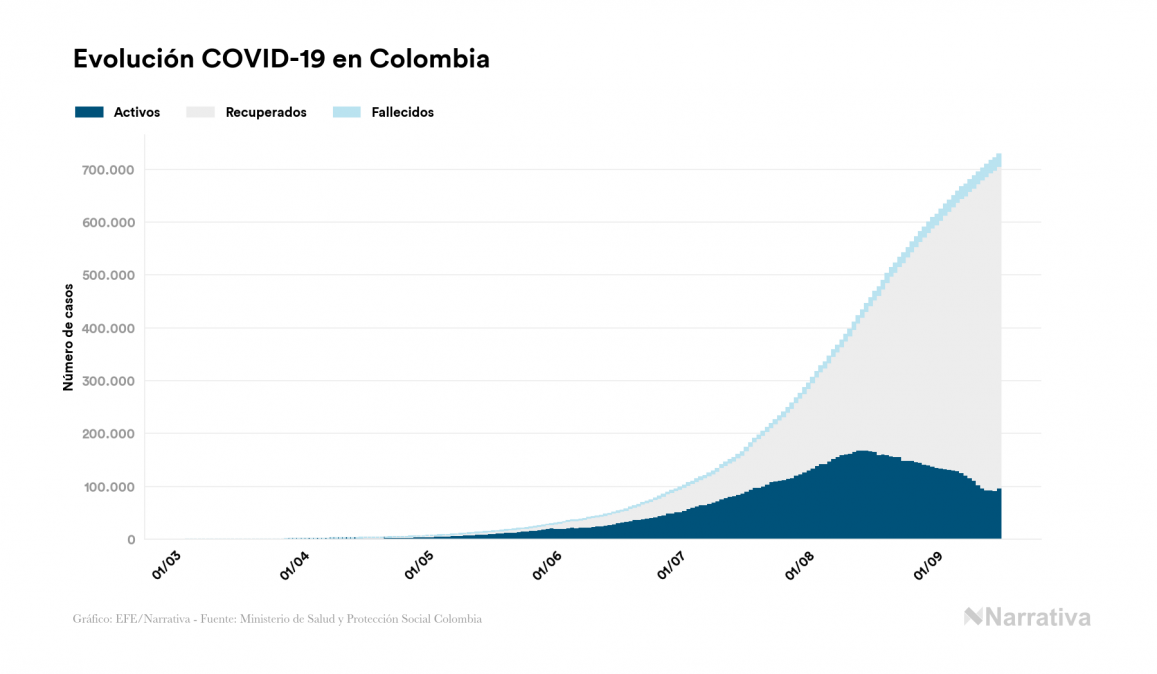 Según los últimos datos, Colombia continúa con 97.324 casos activos de COVID-19 tras confirmarse 6.698 nuevos positivos y 1.053 altas médicas este miércoles. Desde el comienzo de la pandemia, la cifra total de contagiados asciende a 728.590, con 607.978 recuperados y 23.288 fallecidos.