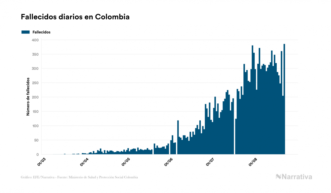 El coronavirus deja ya 522.138 casos de contagio en Colombia, con 156.630 de ellos actualmente activos y 16.568 fallecidos, según los últimos datos correspondientes al 23 de agosto. Además, un total de 348.940 personas ya se ha recuperado desde que se produjo el primer contagio en el país.