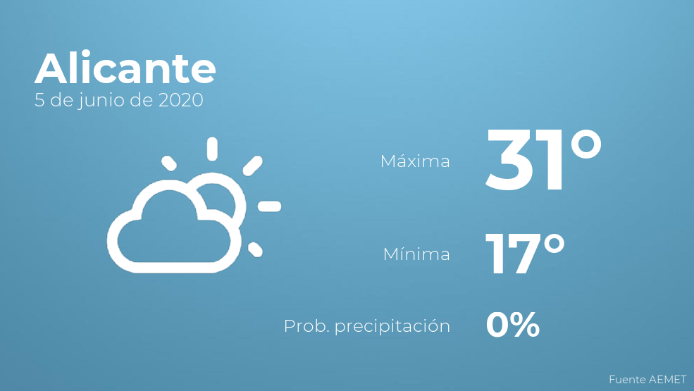 En la mañana de hoy en Alicante tendremos cielos despejados. Por la tarde habrá nubes escasas. Por lo que respecta a las temperaturas, estas oscilarán entre los 31 grados de máxima y 17 de mínima. Además, se esperan vientos del noroeste sin apenas intensidad.