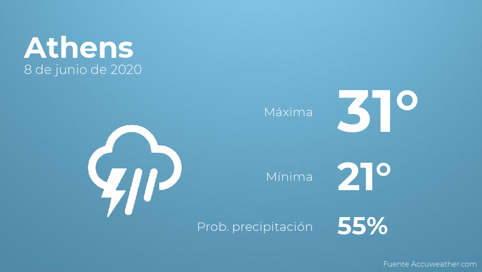 Para las primeras horas del día en Athens el cielo estará cubierto con probabilidad de tormentas y lluvia. Según pasen las horas tendremos más nubes que claros con probabilidad de tormentas y lluvia. En cuanto a las temperaturas, estas oscilarán entre los 31 grados de máxima y 21 de mínima. Además, se esperan vientos del sureste de carácter flojo con rachas de hasta 13 kilómetros por hora.