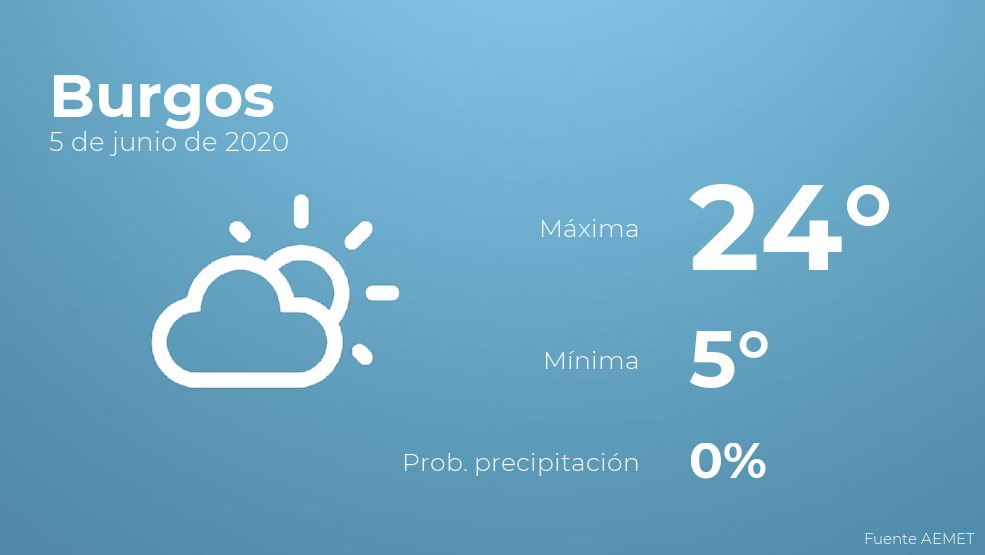 Durante las primeras horas del día en Burgos se esperan cielos despejados. Según pasen las horas habrá nubes escasas. Por lo que respecta a las temperaturas, estas variarán entre los 24 grados de máxima y 5 de mínima. Junto a todo esto, se esperan vientos del oeste de poca intensidad.