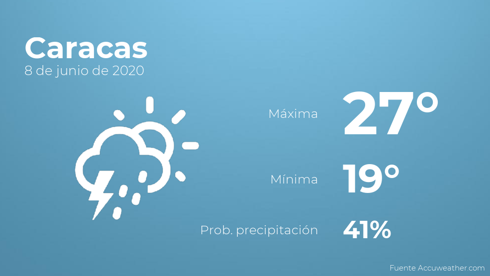 Hoy por la mañana en Caracas tendremos más nubes que claros con probabilidad de tormentas y lluvia. A medida que avance el día se prevén nubes y claros con poca probabilidad de precipitaciones. En relación a las temperaturas, estas variarán entre una máxima de 27 y una mínima de 19 grados. Junto a todo esto, se esperan vientos de carácter flojo con valores de hasta 11 km/h.