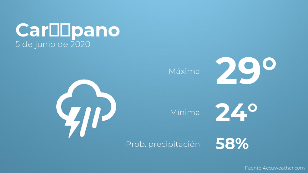 Para hoy en Carúpano el cielo estará cubierto con probabilidad de tormentas y lluvia. Con respecto a las temperaturas, oscilarán entre una máxima de 29 y una mínima de 24 grados. Junto a todo esto, se esperan vientos de poca intensidad con valores de hasta 18 kilómetros por hora.