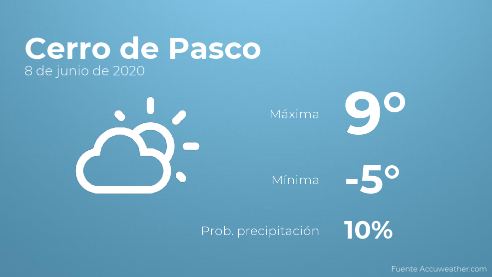 A lo largo de la mañana en Cerro de Pasco habrá escasa nubosidad. A medida que avance el día se esperan pocas nubes con poca probabilidad de precipitaciones. Con respecto a las temperaturas, estas se moverán entre una máxima de 9 y una mínima de -5 grados centígrados. En general, vientos de poca intensidad con valores de hasta 17 km/h.