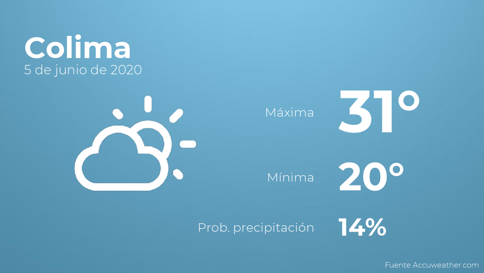 En la mañana de hoy en Colima habrá pocas nubes con poca probabilidad de precipitaciones. Según pasen las horas se prevén nubes y claros con probabilidad de tormentas acompañadas de lluvia. En cuanto a las temperaturas, estarán entre los 31 grados de máxima y 20 de mínima. Junto a todo esto, se esperan vientos de poca intensidad con cifras de hasta 18 kilómetros por hora.