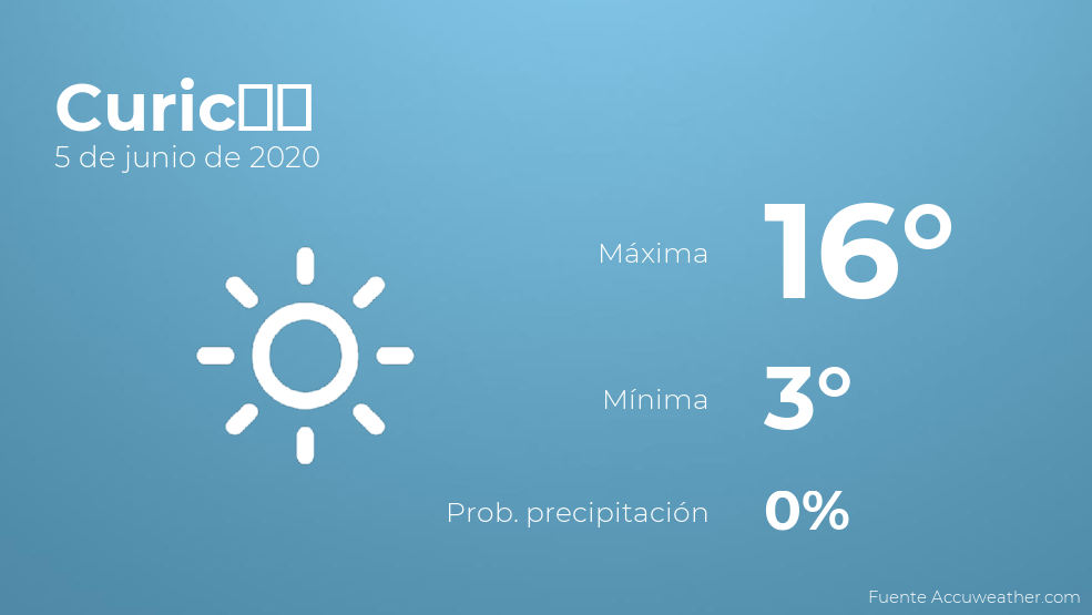 Hoy por la mañana en Curicó se prevén cielos despejados. A medida que avance el día habrá pocas nubes. Las temperaturas oscilarán entre una máxima de 16 y una mínima de 3 grados centígrados. En general, vientos calmados en régimen de brisas.