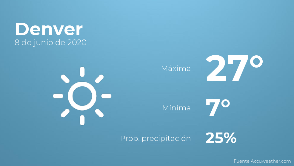 En las primeras horas del día en Denver se prevén cielos despejados con escasa probabilidad de precipitaciones. A medida que avance el día tendremos cielos cubiertos con alguna llovizna. En relación a las temperaturas, estas variarán entre los 27 grados de máxima y 7 de mínima. En general, vientos del este con valores de hasta 74 kilómetros por hora.