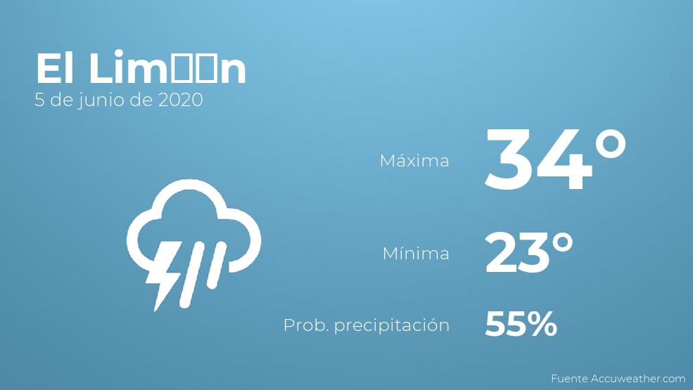 En el día de hoy en El Limón se prevén cielos cubiertos con probabilidad de tormentas y lluvia. Por lo que respecta a las temperaturas, estas se moverán entre los 34 grados de máxima y 23 de mínima. En general, vientos del sur de carácter flojo con cifras de hasta 15 km/h.